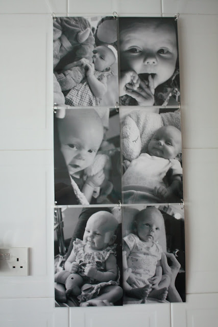 I made this cute collage out of black and white photos today. It's an eye catcher in my kitchen! I laminated the photos (backed with a layer of thin cardboard paper to give it more stability) and then punched small holes into the corners and assembled the whole thing with key rings. You can get photos laminated in most copy or photo shops and key rings are available in stationary shops. For the punching of the holes I used a standard hole punch for paper. Instead of photos you could laminate your kid's art work. That should make for a wonderful collage too!